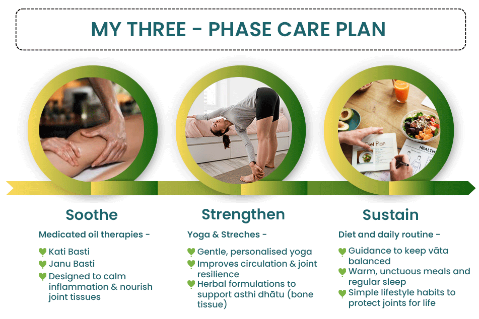 I give you a simple home routine: warm oil massage, balanced meals, seasonal lifestyle tips and joint-friendly movement to keep Vata calm.